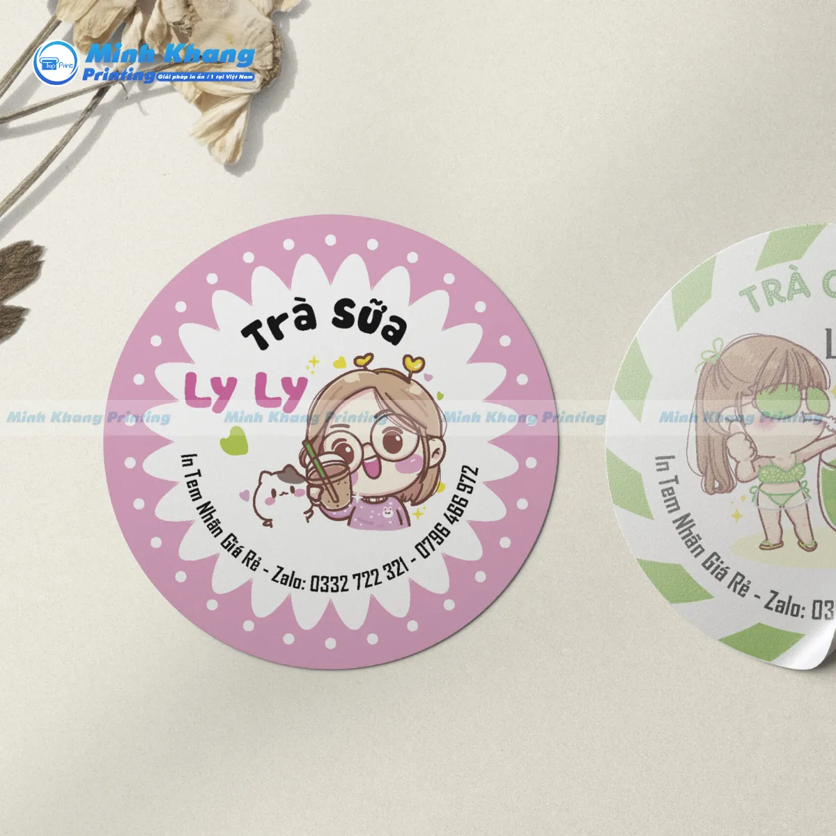 Mẫu tem trà sữa Ly Ly hình tròn đường kính 5cm, kích thước tiêu chuẩn cho ly 500ml