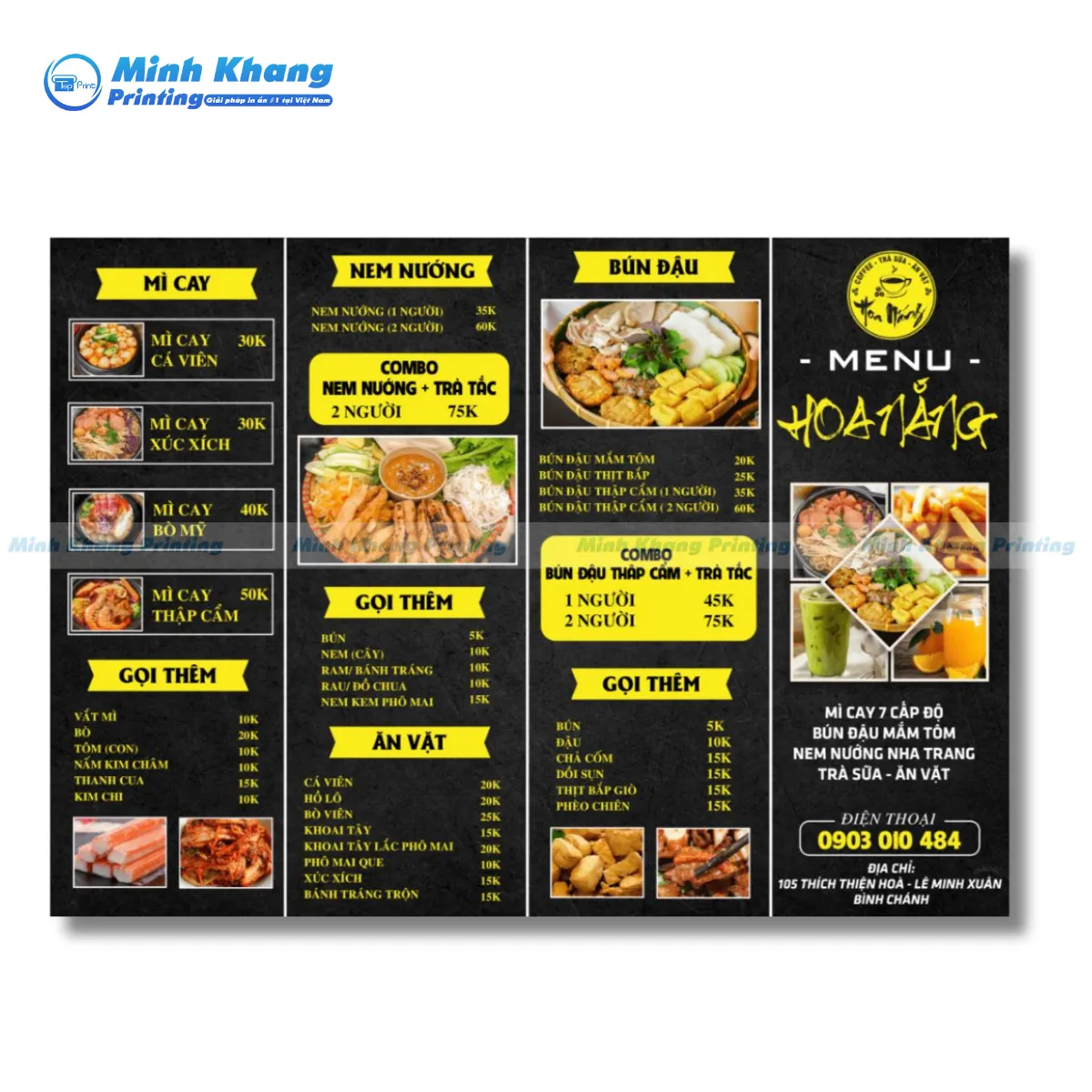 Chính vì vậy, In Minh Khang luôn được nhiều chủ quán bún đậu, nhà hàng và thương hiệu ẩm thực tin tưởng lựa chọn khi có nhu cầu in menu. Nếu bạn đang tìm kiếm một đối tác in ấn uy tín, chất lượng, đồng hành lâu dài thì In Minh Khang chắc chắn là lựa chọn số 1 dành cho bạn.