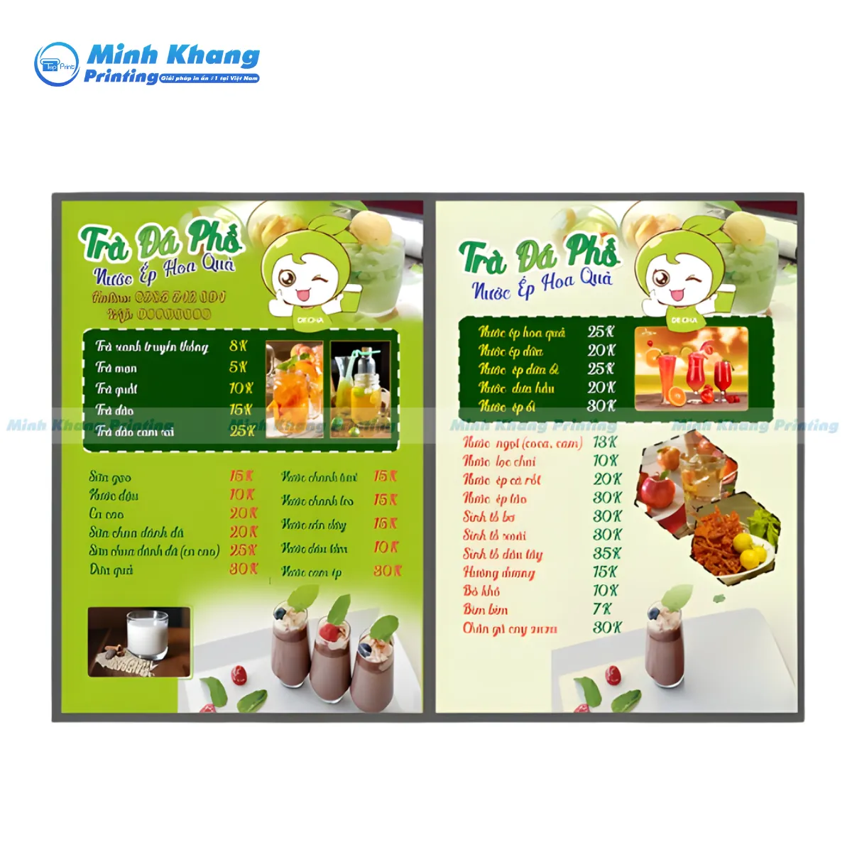 Mẫu menu trà đá phố nước ép hoa quả in formex dán decal 2 mặt