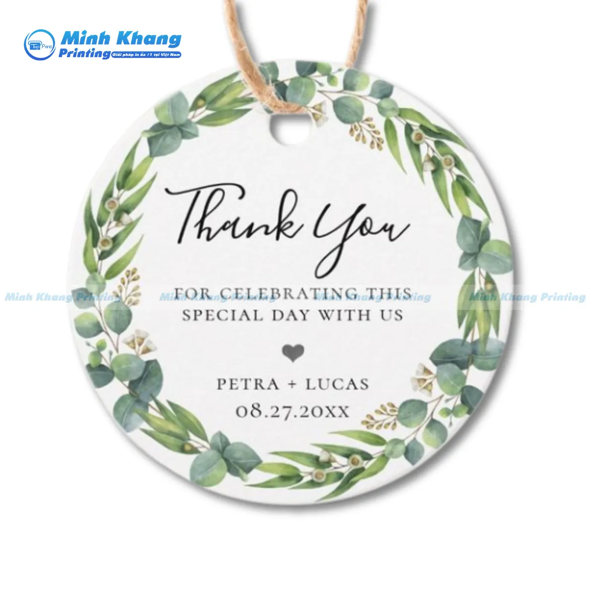 Trong các sự kiện trang trọng như tiệc cưới hay hội nghị khách hàng, tag cảm ơn treo quà tặng đám cưới đóng vai trò như một lời tri ân gửi tới quan khách. Phong cách thiết kế thường hướng tới sự thanh lịch, sang trọng với các tông màu như trắng, kem, vàng đồng. Nội dung thường tối giản, tập trung vào tên chủ nhân bữa tiệc và ngày kỷ niệm, tạo nên một món quà lưu niệm đầy ý nghĩa.