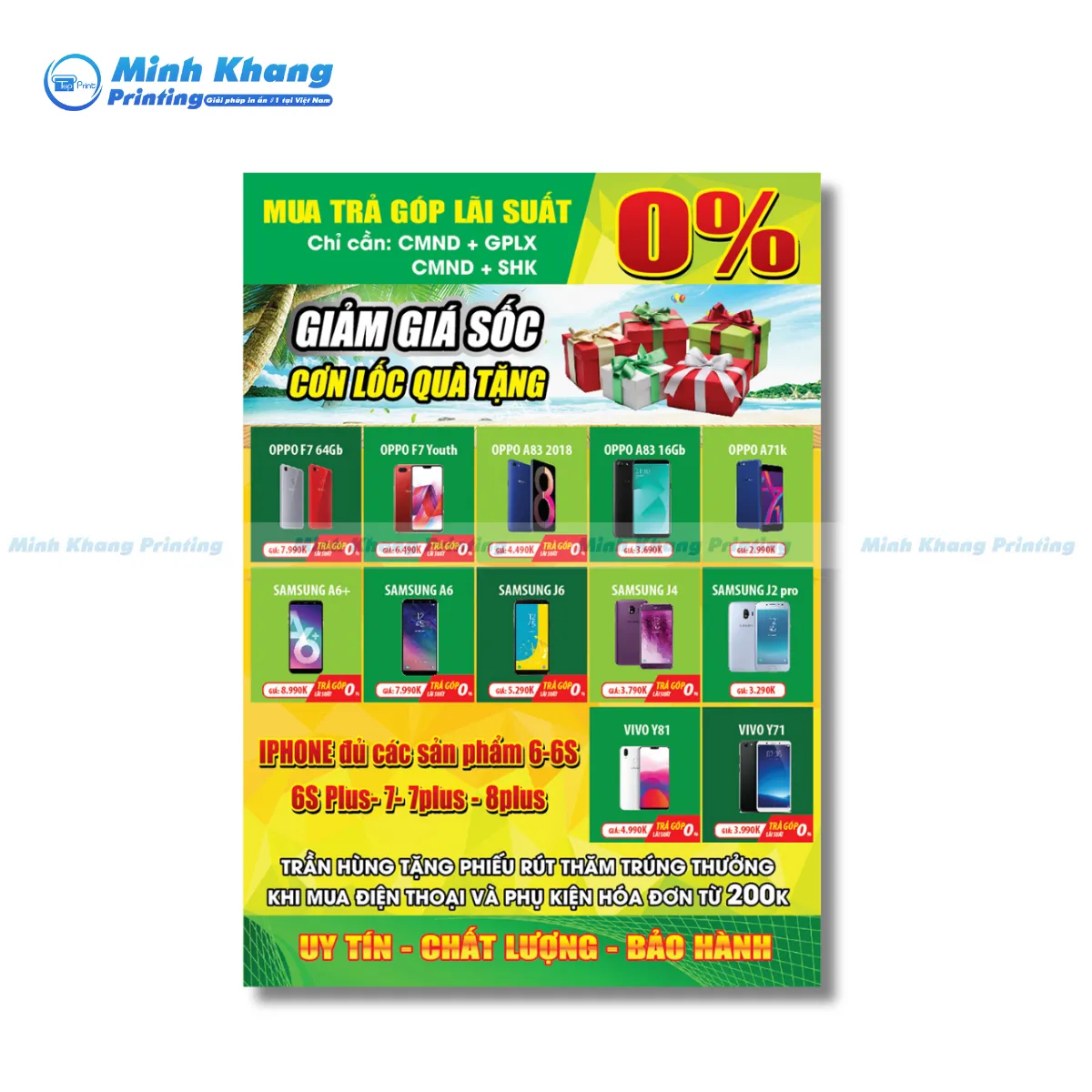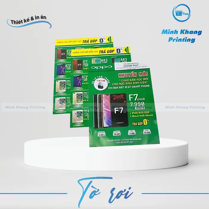 Minh Khang cung cấp dịch vụ in tờ rơi số lượng ít theo yêu cầu, hỗ trợ chỉnh sửa maket cho đến khi khách hàng ưng ý. Chúng tôi cam kết sử dụng công nghệ in hiện đại nhất, đảm bảo độ sắc nét cho từng điểm ảnh của chiếc điện thoại trên tờ rơi của bạn. Đội ngũ designer của chúng tôi luôn cập nhật các xu hướng thiết kế từ các ông lớn như Thế Giới Di Động hay FPT Shop để tư vấn cho bạn những mẫu mã “cháy hàng” nhất.