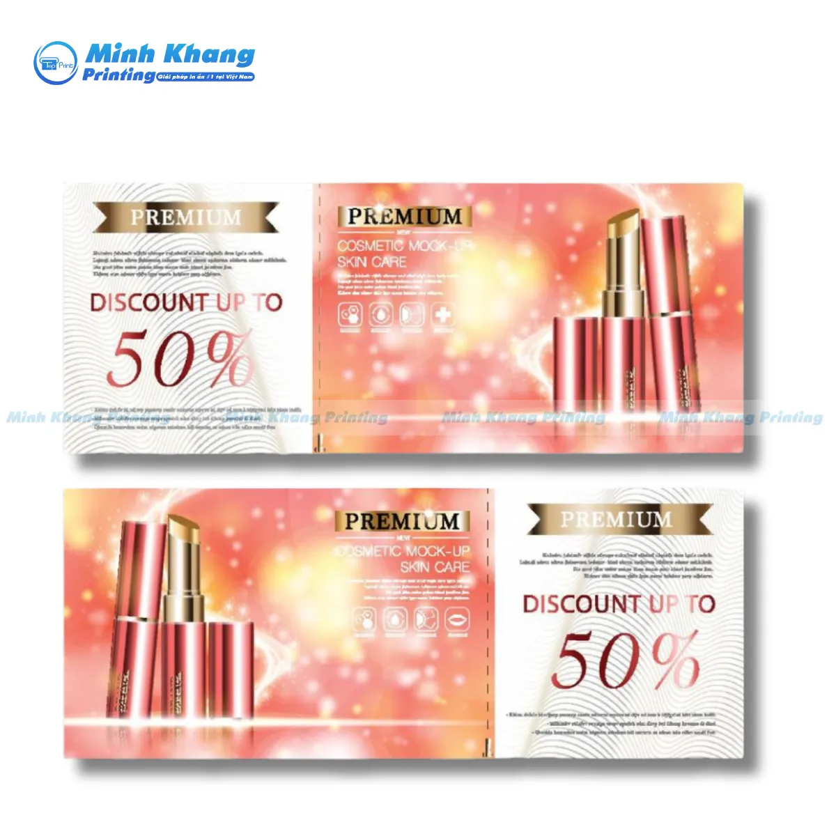 | Giấy Couche | Bề mặt láng, mịn, cho màu sắc tươi sáng. Giá tốt, phù hợp với ngân sách. | Voucher khuyến mãi hàng loạt, số lượng lớn, hoặc các thương hiệu mỹ phẩm tầm trung. |